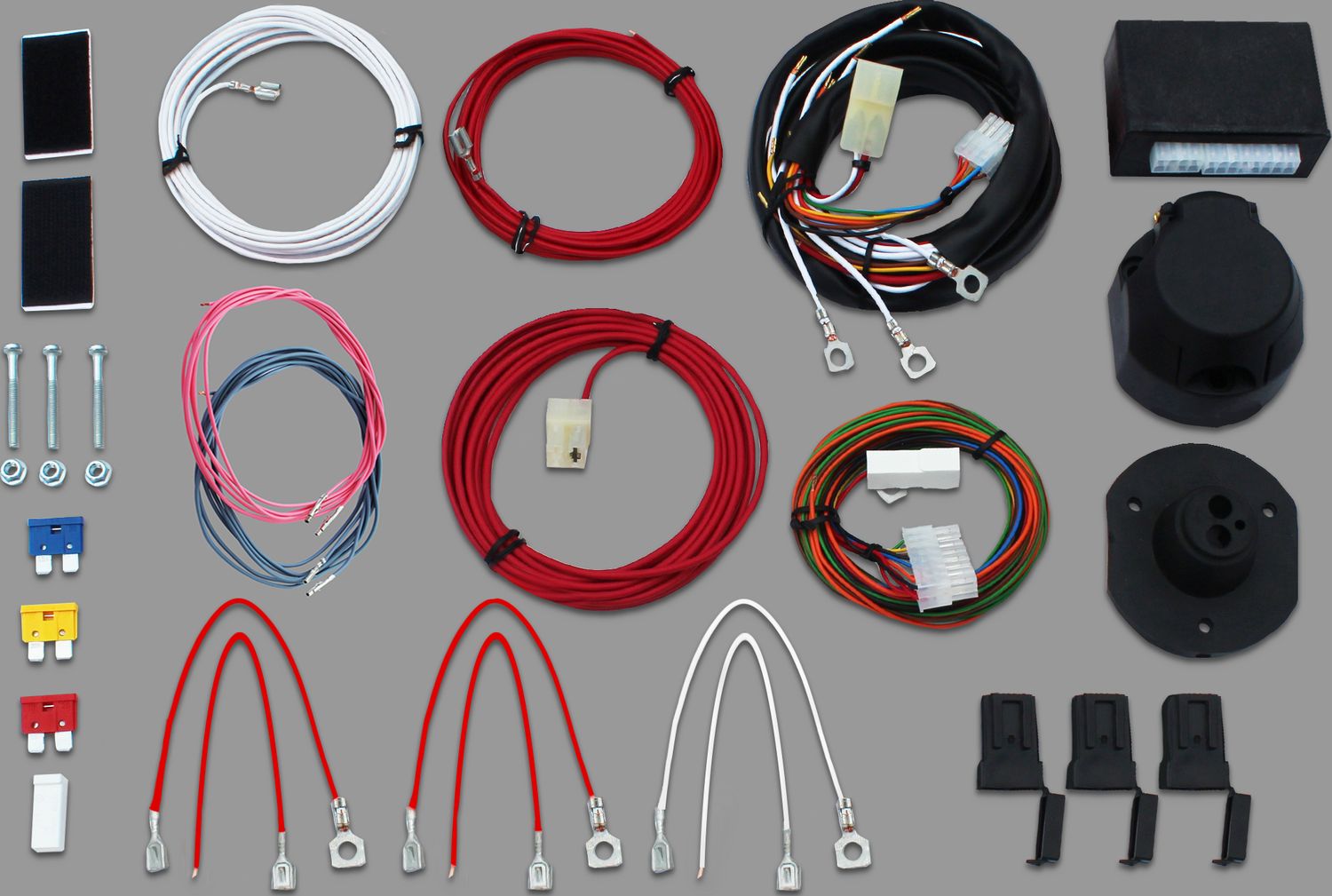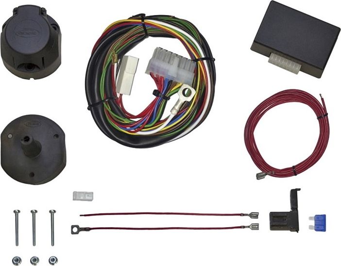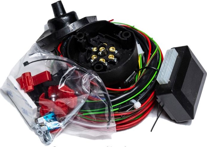 Блок, провода (полный комплект для монтажа), розетка ТСУ с пыльником, монтажный комплект (винты, гайки крепления розетки, корпус предохранителя, предохранитель, разъемы), цветная инструкция, картонная коробка