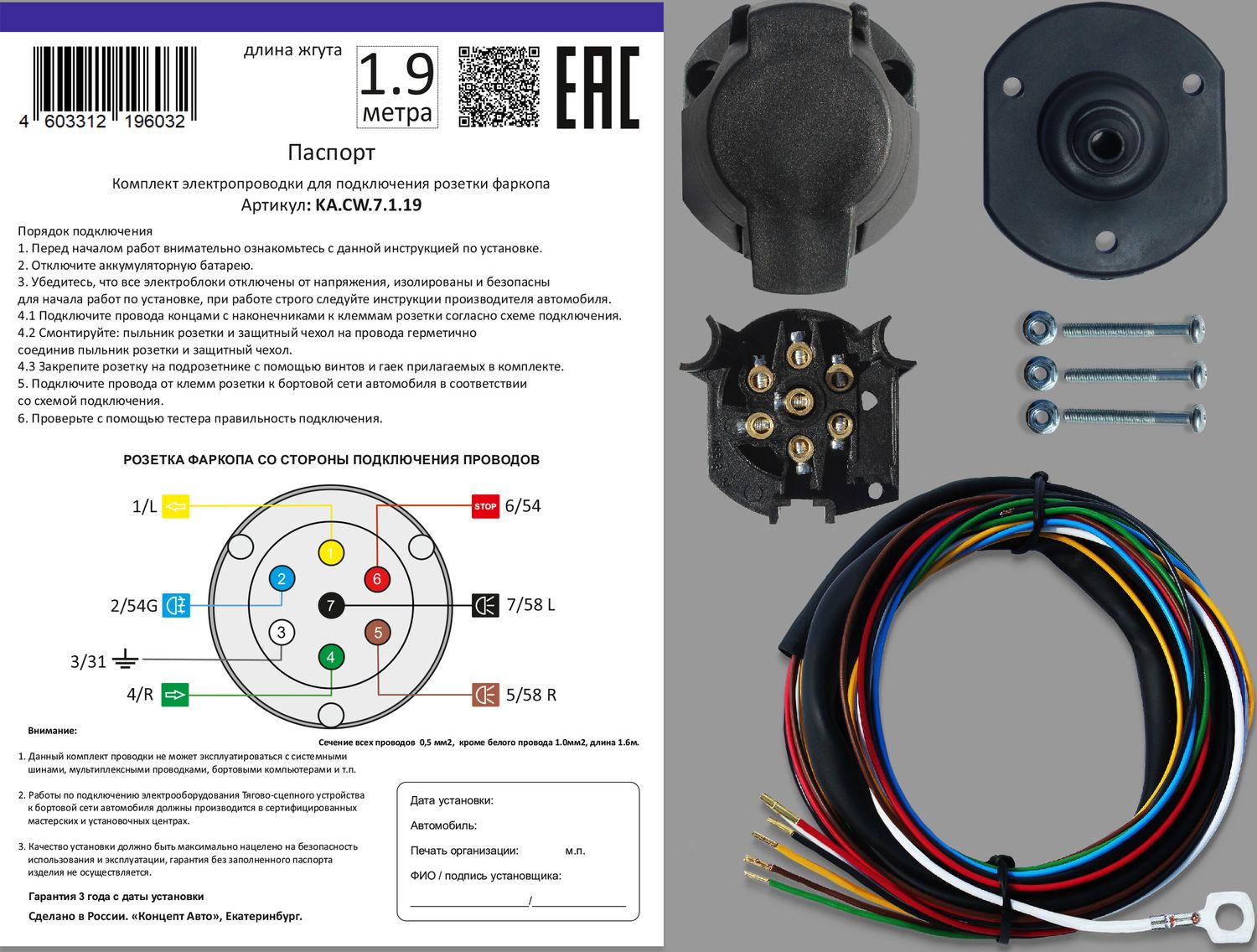 Розетка и провода Концепт Авто для подключения фаркопа (1.9 м, 7 pin). Артикул KA.CW.7.1.19